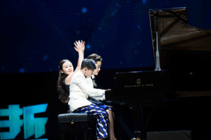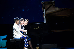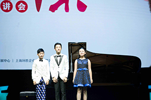▲“中国魔指精灵”蒋泽楷、王阔、Coco.王在演讲会现场六手联弹